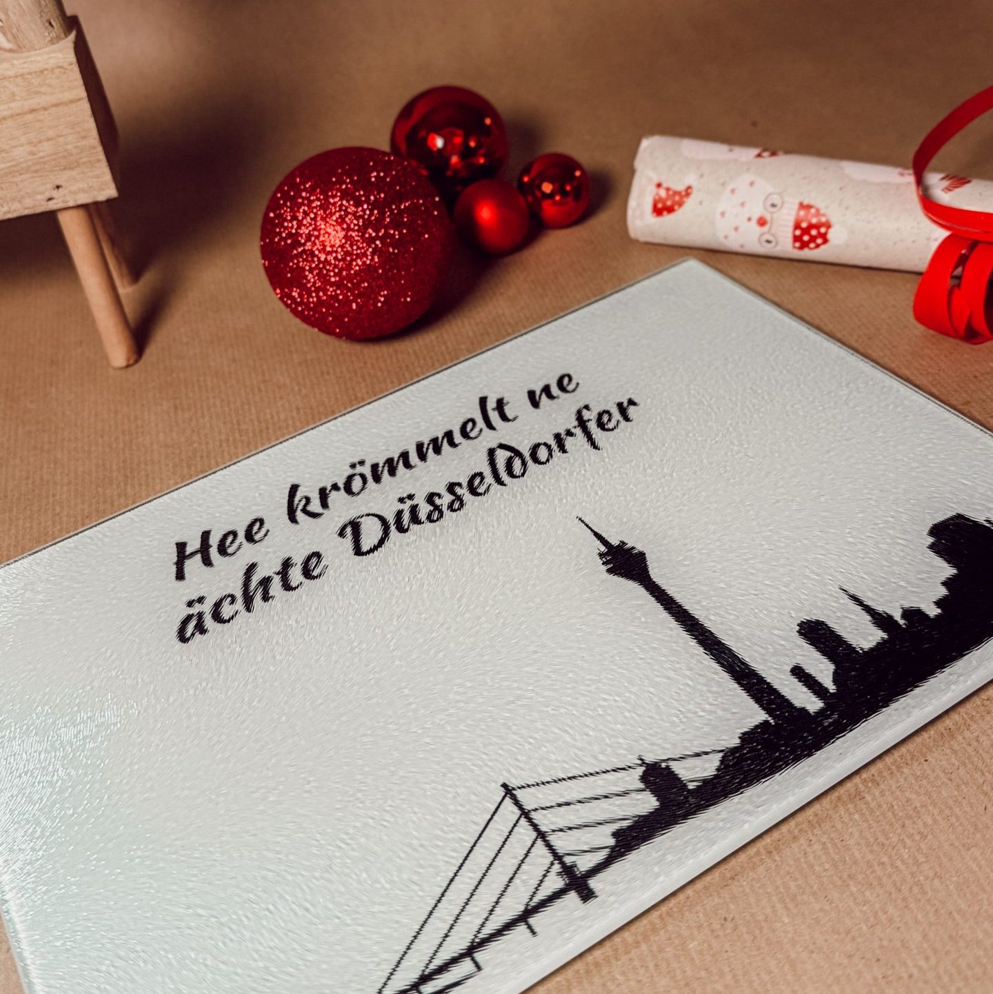 Unser Glasschneidebrett mit Düsseldorf-Motiven bringt nicht nur Funktion in deine Küche, sondern auch ein Stück Heimatgefühl auf die Arbeitsfläche.