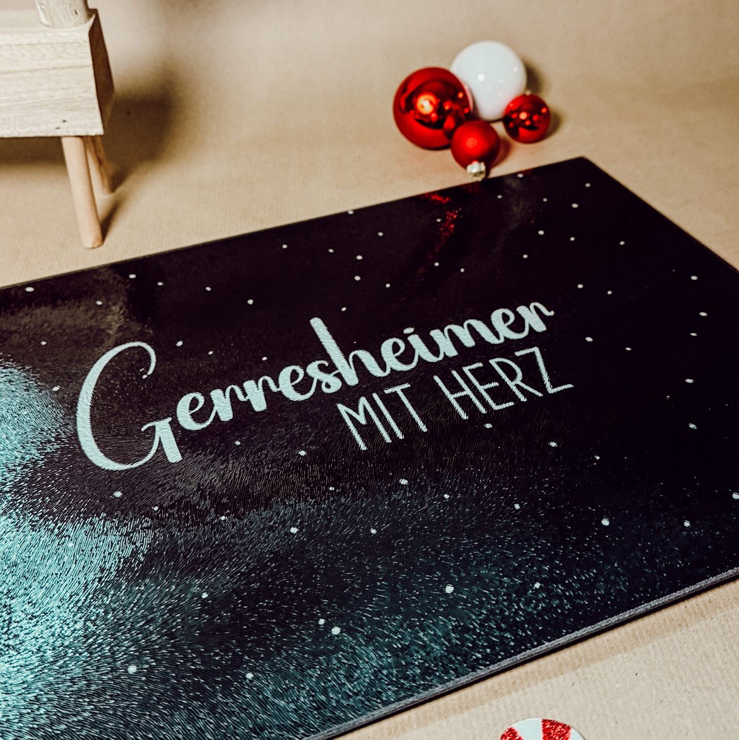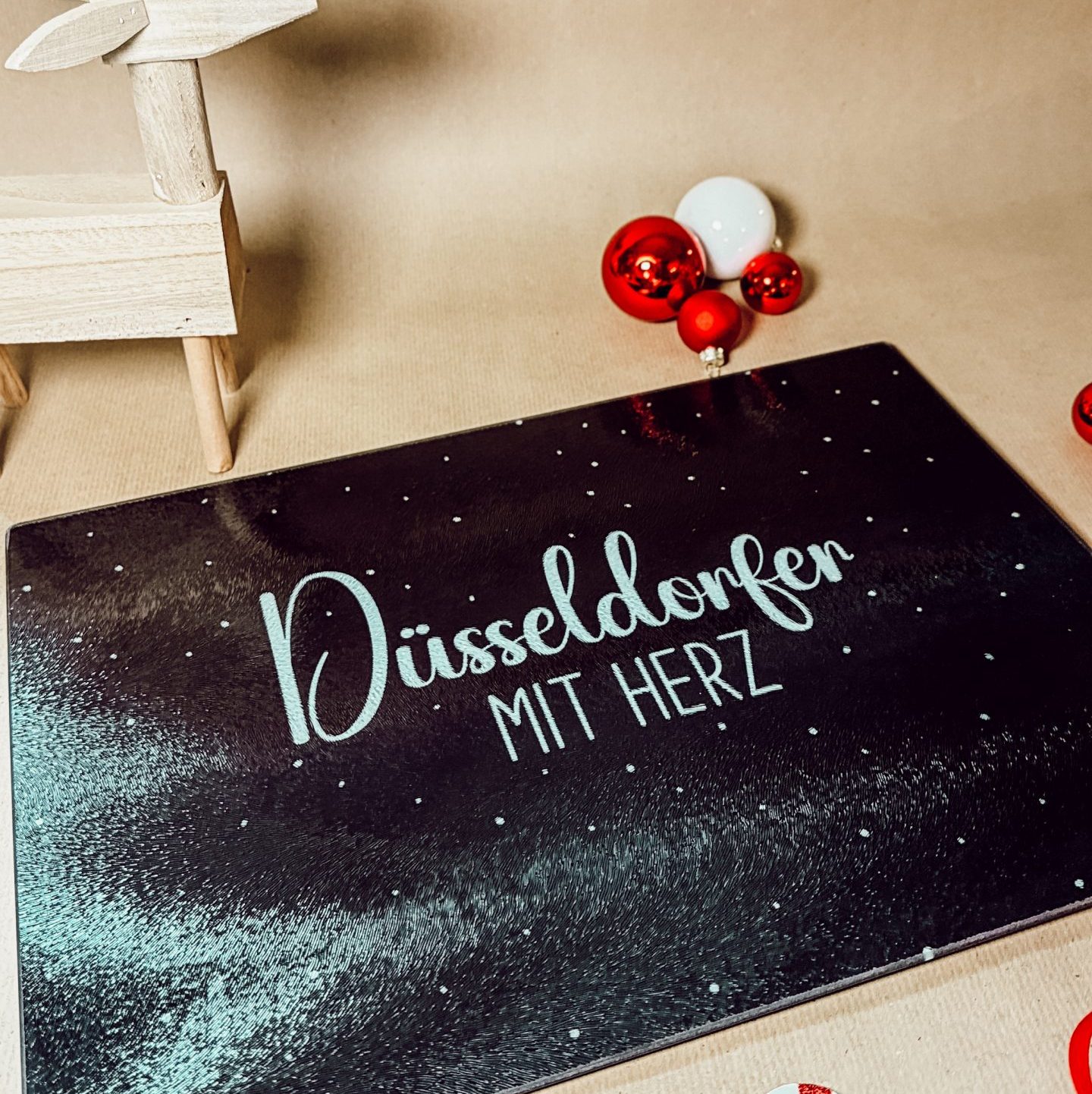 Die hochwertige Glasplatte mit strukturierter Oberfläche eignet sich perfekt zum Schneiden, Servieren und Dekorieren – und zeigt ikonische Grafiken passend zum Thema Düsseldorf.